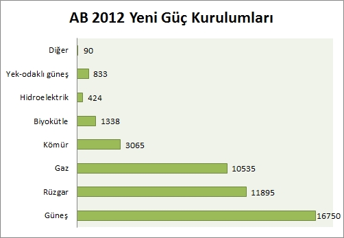 Grafikte 2012 yılında gerçekleştirilen yeni güç kurulumlarının MW cinsinden enerji kaynaklarına göre dağılımı gösterilmiştir. (Kaynak: EWEA)