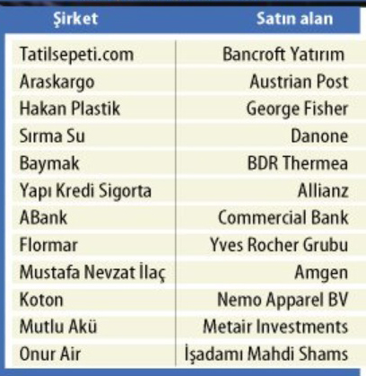 Dün Mutlu Akü, Mutlu Plastik ve Provus Bilişim Hizmetleri’nin yabancılara satılacağı duyrulurken, yılbaşından bu yana 20’ye yakın Türk şirketini yabancılar aldı. Bu sayının yılsonuna kadar artması bekleniyor.