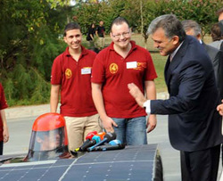 Cumhurbaşkanı Gül, İTÜ Makina Mühendisliği`nin geliştirdiği ve Avustralya`da ekim ayında düzenlenecek World Solar Chalange`de 3 bin km.`lik etapta yarışacak Araba-5 hakkında takım kaptanı Onur Serin`den bilgi aldı. ALTERNATİF enerjinin önemine değinen Abdullah Gül, "Bu konuda çalışmalar yapılması gerekiyor. Bunu hedefleyen insanlar ve ülkeler başarabilir" dedi.